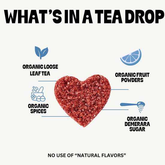 Traditional instant tea is typically made from tea extract and often contains added sugars or flavorings. Tea Drops are made from whole leaf tea, real fruit powders, spices, and essential oils — never artificial flavor packets or corn syrup solids. It’s instant tea with real ingredients.